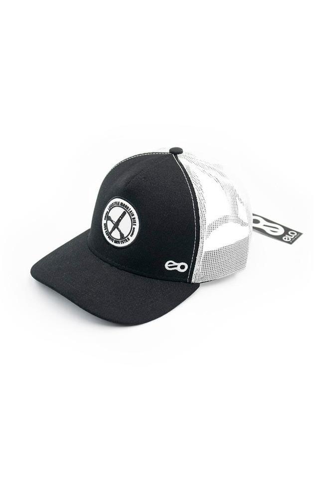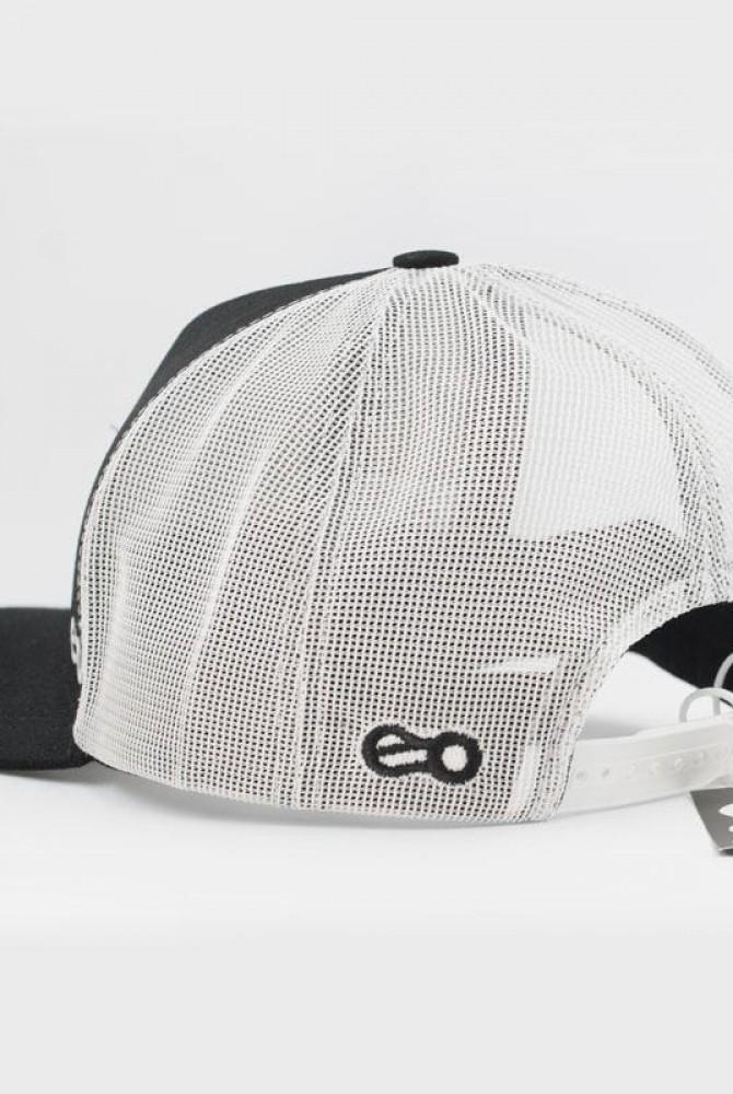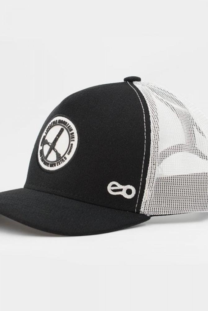 Boné modelo trucker Mtb Lifestyle com frente em preto, aba preta com 6 costuras, tela branca com aplique bordado e silk emborrachado em alto relevo.