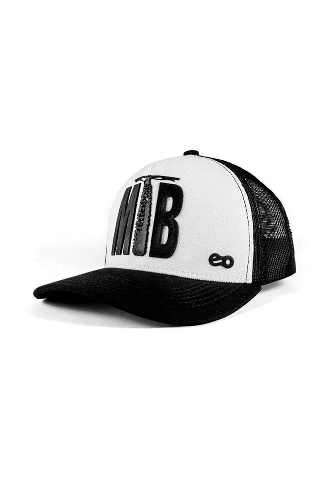 Boné modelo trucker Mtb Lifestyle com frente em algodão branco, aba preta com 6 costuras, tela preta e silk emborrachado em alto relevo.